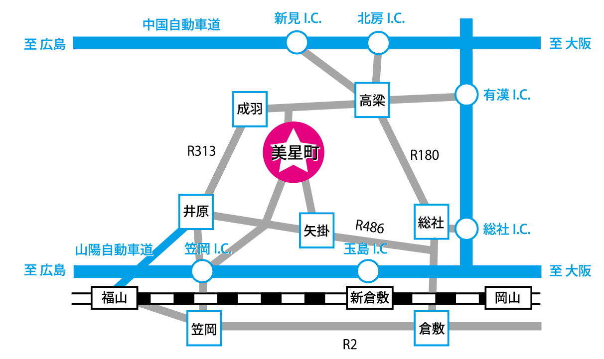 山陽自動車道...笠岡I.C.から約40分、玉島I.C.から約40分